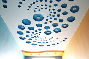 Для зала мы подобрали более 250 готовых перфораций . Потолки APPLY можно установить любой фактуры : мат, глянец, сатин, полупрозрачные и фактурные полотна. Дизайн и фактура непосредственно подбирается под ваш интерьер .